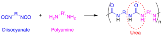 Polyurea is a type of elastomer that is derived from the reaction product of an isocyanate component and an amine component. The isocyanate can be aromatic or aliphatic in nature. It can be monomer, polymer, or any variant reaction of isocyanates, quasi-prepolymer or a prepolymer. The prepolymer, or quasi-prepolymer, can be made of an amine-terminated polymer resin, or a hydroxyl-terminated polymer resin.[1]