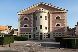 The edifice was built of stone, brick and flint,[10] giving it "a beautiful polychrome appearance".[5] The architecture was neo-classical, and the façades were carefully designed.[4] The architect demonstrated "aesthetic care and [...] refinement": the building was "functional in its plan, rhythmically symmetrical, aesthetically pleasing in its appearance".[12] Harou-Romain drew his inspiration from the nearby 17th-century Viscounty of Auge building, which also features polychromy due to the use of different building materials.[8]