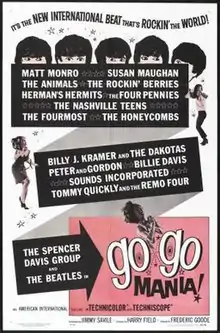 Pop Gear (U.S. title: Go Go Mania) is a British music revue film, directed by Frederic Goode, which was released in 1965. It contains live concert footage of the Beatles, and lip-synched performances of some of the British Invasion bands, including the Animals, Herman's Hermits, the Nashville Teens, Peter and Gordon, Matt Monro, Billy J. Kramer and the Dakotas, the Honeycombs, the Rockin' Berries, and the Spencer Davis Group. The film is split into two segments: 1964 songs, introduced by Jimmy Savile, who at the time was the host of Top of the Pops on the BBC, and 1965 songs, which are merely strung together without intros. The material by the Beatles was lifted from a newsreel short The Beatles Come to Town (1963). The film was released sometime between January and April 1965, the footage having been filmed in December 1964.
