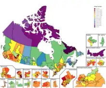 This is a list of Canada's 338 federal electoral districts (also known as ridings in Canadian English) as defined by the 2013 Representation Order, which came into effect on August 2, 2015. The ridings are organized by province. But a click on tabs can re-order them based on riding size or population.