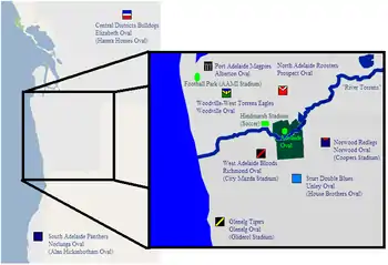 Talk of a side from South Australia entering the Victorian Football League (VFL) was fast-tracked in 1987 when a team from Western Australia, the West Coast Eagles, and a team from Brisbane, the Brisbane Bears, joined the VFL. This left South Australia as the only mainland state in Australia without a team in an increasingly national competition. By 1989, seven out of ten SANFL clubs were recording losses and the combined income of the SANFL and West Australian Football League (WAFL) had dropped to 40% of the VFL.[3] During early 1990 the SANFL decided to wait three years before making any further decision in regards to fielding a South Australian side in the VFL until it could be done without negatively affecting football within the state. Frustrated with lack of progress, Port Adelaide held secret negotiations in the town of Quorn regarding entering the VFL in 1991.[4] From these discussions, Port Adelaide accepted an invitation from the VFL (which had since been renamed the Australian Football League). The AFL signed a heads of agreement with the club in expectation that Port would enter the competition in 1991, meaning the Port Adelaide Football Club would field two teams, one in the AFL and one in the SANFL. During the 1990 preseason, Port Adelaide played a practice match against Geelong at Football Park in front of 35,000 spectators.[5] When the knowledge of Port Adelaide's negotiations to gain an AFL licence were made public, the rest of the SANFL and many other people across the state saw it as an act of treachery. SANFL clubs made an application to the Supreme Court of South Australia for an injunction against the bid, which Justice Olsson agreed to.[3] The AFL suggested to the SANFL that if they did not want Port Adelaide to join the AFL, they could put forward a counter bid to enter a composite South Australian side into the AFL. After legal action from all parties, the AFL finally agreed to accept the SANFL's bid and the Adelaide Football Club was born.[6]