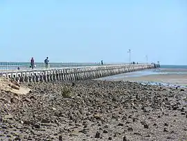 The Port Germein jetty opened in 1881, and in 1883 it was extended to a length of 1680 metres.[12] This length, which was necessary because of the town's extremely shallow beach, briefly made it the longest wooden jetty in the southern hemisphere.[13] Currently, following storm damage and subsequent repairs, the jetty is 1532 metres long, still the longest jetty in South Australia. Previously it had a narrow-gauge railway line extending into the township.[14]