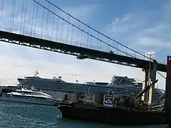 The World Cruise Center, located in San Pedro, Los Angeles, beneath the Vincent Thomas Bridge, has three passenger ship berths.[23]