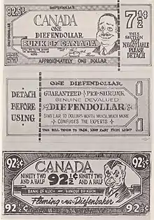 An economic downturn was beginning in Canada by 1958. By mid-1961, differences in monetary policy led to open conflict with Bank of Canada Governor Coyne, who adhered to a tight money policy. Negotiations between Minister of Finance Fleming and Coyne for the latter's resignation broke down, with the governor making the dispute public, and John Diefenbaker sought to dismiss Coyne by legislation. Once he had the opportunity to testify (denied him in the Commons), Coyne resigned, keeping his increased pension, and the government was extensively criticised in the press. By the time Diefenbaker called an election for June 18, 1962, the party had been damaged by loss of support in Quebec and in urban areas as voters grew disillusioned with Diefenbaker and the Tories. The PC campaign was hurt when the Bank of Canada was forced to devalue the Canadian dollar to 92½ US cents; it had previously hovered in the range from 95 cents to par with the United States dollar. Privately printed satirical "Diefenbucks" (pictured) swept the country.