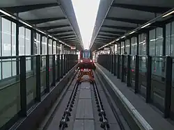 Tram 2548 calls at Arena tram stop. This is one of the trams on the Tramlink network centred on Croydon in south London.