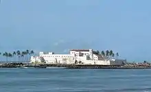 In 1471, Portuguese explorers encountered fishing villages rich with ivory and gold along the Atlantic coast of modern-day Ghana, which the Portuguese called the Gold Coast.[4] The prospect of trade in the Gold Coast region helped spur the construction of the fortress São Jorge da Mina (St. George of the Mine) in 1482, which soon came to be known as Elmina Castle, derived from the Portuguese term "el mina" ("the mine").[6] The castle was erected near a populated African town which was also called Elmina.[7] The other major Portuguese settlements on the Gold Coast included the following:[4]