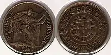 49.88 cents | 25.5 mm | 8.3 g | 2.5 mm | Bi-metallic coin (Aluminium-bronze center plug with a Copper-nickel outer ring) | Pedro Nunes; text "EUROPA" | 1989-2001 | ||