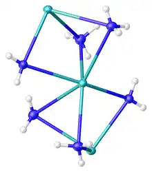 Traditionally KNH2 is viewed as a simple salt, but it has significant covalent character and is highly aggregated in ammonia solution. The compound has been characterized by X-ray crystallography as the solvent-free form[3] as well as the mono- and diammonia solvates. In KNH2·2NH3, the potassium centers are each bonded to two amido ligands and four ammonia ligands, all six of which bridge to adjacent potassium centers. The result is a chain of hexacoordinate potassium ions. The K–NH2 distances are 2.7652(11) whereas the K–NH3 distances are respectively 2.9234(11) and 3.0698(11) Å.[4]