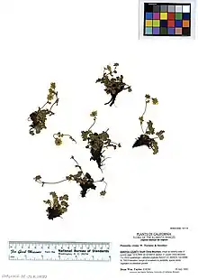 Potentilla cristae is a rare species of cinquefoil known by the common name crested cinquefoil. It is endemic to the Klamath Mountains of far northern California, where it is known from a few occurrences in the subalpine and alpine climates of the high mountain ridges. It grows in talus and moist rocky or gravelly serpentine soils. This is a low, matted plant producing a clump of hairy, glandular herbage up to about 20 centimeters tall. Each hairy leaf is divided into three rounded leaflets which are toothed or lobed and measure up to 2 centimeters in length. The inflorescence is a cyme of a few flowers, each with five small yellow petals. The fruit is a minute achene just a millimeter wide, which is smooth with a crest.