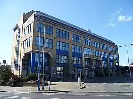 The current station building, in a "post modern" style, is the third on this site. It replaced a 1955 structure designed by James Wyatt[8] of the Eastern Region Architect's Department (Chief Architect H Powell). Pevsner described the 1955 station as "The first of the Eastern Region's good modern stations, the style much lighter in touch than in the stations of the 1960s (cf Broxbourne). Neat brick clerestory-lit booking hall".[9]