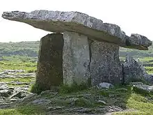 Poulnabrone dolmen (Irish: Poll na Brón, lit. 'Hole of Sorrow'[2]) is a large dolmen (or cromlech,[3] a type of single-chamber portal tomb) located in the Burren, County Clare, Ireland. Situated on one of the most desolate and highest points of the region, it comprises three standing portal stones supporting a heavy horizontal capstone, and dates to the Neolithic period, with estimates to between 4200 BC and 2900 BC. Although not the largest, it is the best known of the approximately 172 dolmens in Ireland.