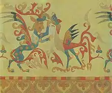 Especially in the western steppes metal wares are found almost exclusively decorated with elements of the animal style; in the permafrost of south Siberia and Transbaikal, felt carpets and other textiles with elements from the animal style are also found, among which a felt swan stuffed with moss deserves special attention.[18] Stone was only used a little, mostly in the so-called "deer stele," probably anthropomorphic grave stele, which were decorated with deer and are found in south Siberia, Transbaikalia and Mongolia. Finally, the bodies of important people were tattooed with motifs from the animal style.