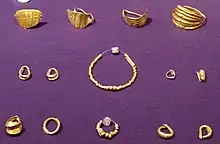 The thesaurus found in 1840 at Țufalău, Covasna County, in the area of the Wietenberg culture, speaks clearly of the wealth and refined tastes of a social elite. Kept in a clay pot, the thesaurus contained several solid gold axes, ornamental phalerae with spiral motifs, hair rings, one bracelet and one large gold piece. A great number of gold and silver items (bracelets, loop rings, etc.) were found at Oarța de Sus, with accurate stratigraphy, in a ritual space belonging to the Wietenberg culture. Such thesauruses containing hundreds of pieces weighing several kilograms, such as those at Sarasău, Maramureș County) or Hinova, Mehedinți County, are few and likely to represent the community treasure. They are outnumbered by those displaying fewer items which seem to have been the private property of some leaders.