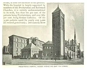 Presbyterian Hospital was a New York City hospital. It was founded in 1868 and began operations in 1872. It was originally located between East 70th Street and 71st Streets and Madison and Park Avenue. The hospital expanded continuously throughout the late 19th century, adding an outpatient dispensary in 1888, a school of nursing in 1892, and additional beds and services in 1892, 1893, 1904 and 1912.[1]