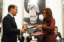In April 2010, Chile's new president Sebastián Piñera was received in Buenos Aires on his first foreign tour abroad and reaffirmed the current strong ties between the two countries.[62] following which Cristina Fernández attended the Nuclear Security Summit in Washington DC, after which President Barack Obama thanked Argentina for its role in international stabilization and earthquake relief efforts in Haiti.[63] Back in Buenos Aires, she received the President of Russia Dmitry Medvedev the first such visit in Argentina's history. Two days later, the Prime Minister of Vietnam Nguyễn Tấn Dũng arrived.[64] On 19 April, she was invited to the bicentennary of the independence celebrations in Venezuela, where she was the main speaker in front of the National Assembly.[65] She signed 25 trade agreements with Venezuela relating to food, technology and energy.[66]