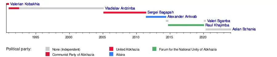 5 | Aslan Bzhania (born 1963) | 23 April 2020 | Incumbent | 3 years, 269 days | Independent | 2020 | Badr Gunba (since 2020) |
