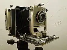 A press camera is a medium or large format view camera that was predominantly used by press photographers in the early to mid-20th century. It was largely replaced for press photography by 35mm film cameras in the 1960s, and subsequently, by digital cameras. The quintessential press camera was the Speed Graphic.[1] Press cameras are still used as portable and rugged view cameras.