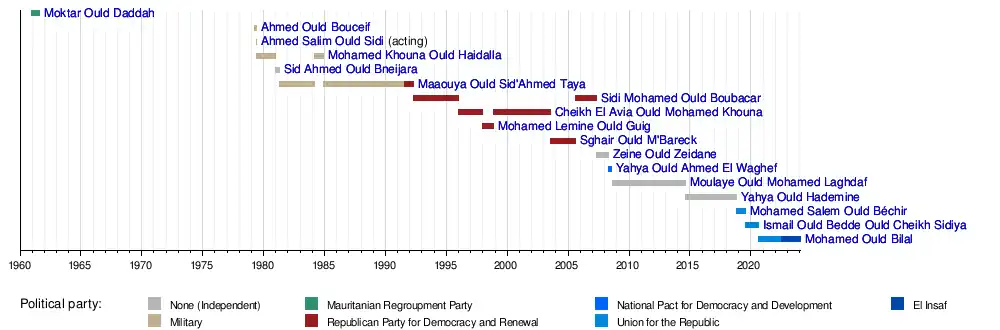 A total of sixteen people have served as Prime Minister of Mauritania (not counting one Acting Prime Minister). Additionally, three persons, Maaouya Ould Sid'Ahmed Taya, Sidi Mohamed Ould Boubacar and Cheikh El Avia Ould Mohamed Khouna, have served on two non-consecutive occasions.