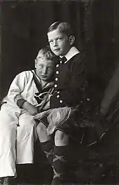 Much of John's early life was spent at Sandringham with his siblings—Prince Edward (known as David to the royal family), Prince Albert, Princess Mary, Prince Henry and Prince George—under the care of their nanny Charlotte "Lala" Bill.[4] Though a strict disciplinarian,[note 2] John's father was affectionate toward his children;[7] John's mother was close to her children and encouraged them to confide in her.[8] In 1909, John's grandaunt, the Dowager Empress of Russia, wrote to her son: "George's children are very nice ... The little ones, George and Johnny are both charming and very amusing".[9] John's aunt Princess Alice, Countess of Athlone, described him as "very quaint and one evening when Uncle George returned from stalking he bent over Aunt May and kissed her, and they heard Johnny soliloquize, 'She kissed Papa, ugly old man!'"[10] George V once told U.S. President Theodore Roosevelt that "all [his] children [were] obedient, except John"—apparently because he alone, among the king's children, escaped punishment from their father.[2]