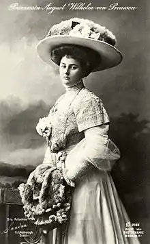 They married on 22 October 1908 at the Royal Palace of Berlin. The marriage was arranged by the Emperor and Empress, but it was relatively happy. Alexandra was a great favorite of her mother-in-law, especially since the Empress was also her own aunt.[1] A contemporary of the court, Princess Catherine Radziwill, commented that Alexandra "had always shown herself willing to listen to her mother-in-law. She is a nice girl - fair, fat, and a perfect type of the 'Deutsche Hausfrau' dear to the souls of German novel-writers".[2] Another contemporary wrote that the marriage had been a love match, and that Alexandra was a "charmingly pretty, bright girl".[3]