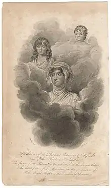 Prior to 1788, King George had told his daughters that he would take them to Hanover and find them suitable husbands[13] despite misgivings he had, which stemmed from his sisters' own unhappy marriages.[14] He remarked, "I cannot deny that I have never wished to see any of them marry: I am happy in their company, and do not in the least want a separation."[15] However, the King suffered his first bout of madness that year, when Amelia was aged five. Further lapses into insanity occurred in 1801 and 1804, thus forestalling talk of marriage for his daughters. The question of matrimony was rarely raised; Queen Charlotte feared that the subject, which had always discomfited the King, would push him back into insanity. Furthermore, the Queen, under strain due to her illness, wanted the princesses to remain close to her.[9][15][16]