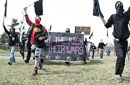 A black bloc group marches as part of an Iraq War protest in Washington, D.C., March 21, 2009. The full text of the banner reads, "Fight the rich, not their wars."