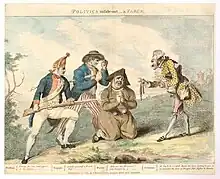 However, this was a political impossibility for the States of Holland: for the democrats the admission of the Princess to The Hague had acquired great symbolic significance. If the "triumvirate" of "aristocratic" Patriot pensionaries (Zeebergh, de Gijselaar, and van Berckel) and the Grand Pensionary Pieter van Bleiswijk would accede to the Prussian demand, that would cause a popular insurrection against them.[20] The lack of a positive reaction of the Holland government caused a shift in the stance of the Prussian government, promoted by Hertzberg, who was assisted by a "leak" of the British government to the Prussians of its correspondence with the French government about its demand to be allowed to join the mediation. This made clear that the French already had acceded to this demand, without informing the Prussians. It also became clear that the British were far more enthusiastic about putting pressure on the Patriots than the French. Harris always had sonorously given as his motive his respect for "the Ancient Dutch Constitution" (by which he meant the arrangement that had been instituted in 1747 and was therefore at the time only forty years old) that had to be Restored (also because it implicitly guaranteed British "rights" to a preponderant position in the Low Countries in the name of maintaining the Balance of Power on the Continent). This fully complied with the Orangist position in the conflict with the Patriots. In other words, the British standpoint was incompatible with the French one as a basis for a compromise to be imposed in the mediation. But it was attractive to Prussia, because the British fully supported the king's demand for "satisfaction", and they encouraged him to take military steps.[21]