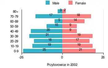 According to the 2002 Poland census, there were 266 people residing in Przyborowice village, of whom 51.9% were male and 48.1% were female. In the village, the population was spread out, with 29.3% under the age of 18, 36.1% from 18 to 44, 13.2% from 45 to 64, and 21.4% who were 65 years of age or older.[1]