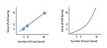 Paul Slovic, a prominent psychologist in the realm of risk, maintains the original interpretation posited by Lifton. Slovic's article, "Psychic Numbing and Mass Atrocity", returns to the collectivist model and most notably confronts the value of saving a human's life. The figures to the right denote both arguments for the hypothesized value of saving a human's life as well as the true value of saving a human's life established through Slovic's empirical research.[1][2] Slovic introduced the concept of psychophysical numbing, which is the diminished sensitivity to the value of life and an inability to appreciate loss.[2] Essentially, the proportion of lives saved is more important than the number of lives saved.[2] One of Slovic's arguments for this outcome is that people suffer from innumeracy and cannot comprehend the emotional connotation associated with large numbers. The threshold, as stated by Slovic, where people cannot comprehend the emotional magnitude of the loss of life is two, as shown in the figure. Paul and researchers say findings can be summarized with "The more who die, the less we care."[2][9]
