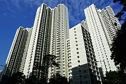 Kwai Hing Estate (Chinese: 葵興邨) was built in the valley of Gin Drinkers Bay,[24] later the town centre of Kwai Chung. Kwai Hing station is named after the name of the estate. It comprises 4 buildings with a total of 400 rental units (TPS units excluded) and 1 shopping arcade. Before redevelopment, it consisted of 5 buildings which were completed between 1970 and 1972. In 1985, the HKHA announced that the strength of the concrete in blocks 3, 4 and 5 of Kwai Hing Estate were below standard.[25] All the blocks were later demolished between 1988 and 1992 to cope with the estate redevelopment.[22] The estate was later redeveloped with 5 buildings between 1991 and 1992.