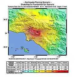 A magnitude 5.1 earthquake occurred on March 28, 2014 at 9:09:42 p.m. on the Puente Hills Fault and was centered 1 mile east of La Habra, California. It had a maximum Mercalli intensity of VII (Very strong) and caused a total of $10.8 million in damages.[7][8]