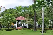 The small bay around which the city was built provides a natural harbor. Puerto Plata is the largest city on the northern seaboard. Its subdivisions include: El Cupey, Maimón, Los Mameyes, Sabana Grande, El Toro, Tubagua and Yásica. The mountain Isabel de Torres is situated some 5 km to the southwest of the city of San Felipe. Geographically it forms part of the Cordillera Septentrional, reaching a maximum height of 800 m above sea level. It is possible to drive to the top of the mountain by following the highway Don José Ginebra. The highway, upon leaving the city, continues west, passing the populated areas of San Marcos, Piedra Candela and El Cruce, arriving at a paved section that continues southeast and then leads directly to the top. The area surrounding Loma Isabel de Torres has been declared a National Monument with an area that covers approximately 20 km2. At the summit there is a tropical botanical garden covering about 7 acres (28,000 m2), featuring 600 varieties of tropical plants.