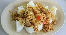 Many of the arrowroots and root vegetables used in Puerto Rican cuisine, collectively known as viandas, have their roots in the diets of the indigenous Taíno people.[12][13] These include cassava (Spanish: yuca) and three kinds of tannier (Spanish: yautía)[14] which are staples in traditional Puerto Rican dishes.[15] Other popular root vegetables include sweet corn root (Spanish: lerén), sweet potato (Spanish: batata mameya), arracacia xanthorrhiza (Spanish: apio criollo), white sweet potato (Spanish: batata) this potato has a purple flesh but white inside and yambee (Spanish: yambi), all of which are cultivated in the mountain regions of the island.[16]