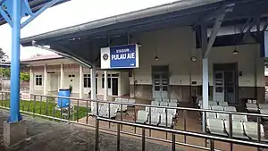 Pulau Aie Station (PLA), also spelled by its old name Puluaer Station or in Malay as Pulau Air Station, is a class-I railway station located in Pasa Gadang, Padang Selatan, Padang, West Sumatra, Indonesia. It is the first railway station built in the city, situated quite close to the historic old town of Padang. Located at the altitude of +2 m, it is operated by the Regional Division II West Sumatra of Kereta Api Indonesia as a part of railway line reactivation throughout West Sumatra.[1] It has two railway tracks with original line continues southwest to the old port of Muaro, but the line is not reactivated. Since 2007, the government of Padang City officially designated the station as a cultural property.[2]