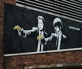 Pulp Fiction is a type of work by stencil graffiti artist Banksy. Instances of it depict the characters played by Samuel L. Jackson and John Travolta in the 1994 film Pulp Fiction, with their guns replaced by bananas.[1] A stencil graffiti work existed on a wall near the Old Street tube station in the City of London from 2002 to 2007.[2] Prints of the image on its original site have been sold for £1,000. A print of the Pulp Fiction stencil was sold for £10,600 in 2012.[3] On 24 November 2020 a signed print has fetched £125,000 at Tate Ward Auctions' "By Collectors for Collectors" event.[4]