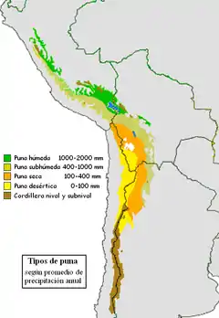 This ecoregion is a high elevation, wet, montane grassland in the southern high Andes, occurring from northern Peru to northern Bolivia. The wet puna shares its border on the west with the Sechura desert and the east with the wet Peruvian Yungas. The characteristically mountainous landscape contains high lakes, mountain valleys, snow-covered mountains, and plateaux.[2] The high elevation of the wet puna (4200 to 5000 m) causes the area to have large temperature differences between night and day. The average annual temperature is low, ranging from 5 to 7 °C; with night frost periods from March to October. Temperatures shift from characteristic summer highs in the day and drop to winter lows at night. This extreme temperature shift has caused selective adaptation to occur and many endemic plants such as the Culcitium, Perezia, and Polylepis center their diversity in the wet puna.[3] The ecoregion contains snow-capped peaks, glacial lakes, and several rivers that originate in the Cordilleras. The biggest lake in the ecoregion is Lake Titicaca, which is the highest navigable lake in the world, at an elevation of 3800 m (above sea level). The Suches and Tiwanacu rivers in Bolivia are the lakes tributaries. The areas in the north surrounding Lake Titicaca have eight wet months, and the areas in the south have one to two wet months.[2] The average precipitation in this region ranges from 400 to 2000 mm.