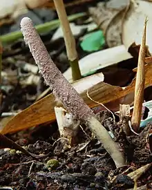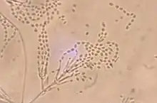 Purpureocillium is a fungal genus in the Ophiocordycipitaceae family. The genus now contains at least 5 species with the type species Purpureocillium lilacinum, a common soil mold.[3] It has been isolated from a wide range of habitats, including cultivated and uncultivated soils, forests, grassland, deserts, estuarine sediments and sewage sludge, and insects. It has also been found in nematode eggs, and occasionally from females of root-knot and cyst nematodes. In addition, it has frequently been detected in the rhizosphere of many crops. The species can grow at a wide range of temperatures – from 8 to 38 °C (46 to 100 °F) for a few isolates, with optimal growth in the range 26 to 30 °C (79 to 86 °F). It also has a wide pH tolerance and can grow on a variety of substrates.[4][5] P. lilacinum has shown promising results for use as a biocontrol agent to control the growth of destructive root-knot nematodes.