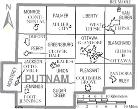 Putnam County is a county located in the northwestern part of the U.S. state of Ohio. As of the 2020 census, the population was 34,451.[1] Its county seat is Ottawa.[2] The county was created in 1820 and later organized in 1834.[3] Its name is in honor of Israel Putnam, a colonial officer in the French and Indian War, who served as a general in the American Revolutionary War.[4] The Blanchard River, which passes through the county, was a key transportation route for early European-American settlers.