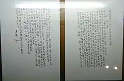 In March 1922, the Dowager Consorts decided that Puyi should be married, and gave him a selection of photographs of aristocratic teenage girls to choose from.[57] Puyi first chose Erdet Wenxiu as his wife, but was told that she was acceptable only as a concubine, so he would have to choose again.[58] Puyi later claimed that the faces were too small to distinguish between.[59] Puyi then chose Gobulo Wanrong, the daughter of one of Manchuria's richest aristocrats, who had been educated in English by American missionaries in Tianjin, who was considered to be an acceptable empress by the Dowager Consorts.[60] On 15 March 1922, the betrothal of Puyi and Wanrong was announced in the newspapers. On 17 March, Wanrong took the train to Beijing, and on 6 April, Puyi went to the Qing family shrine to inform his ancestors that he would be married to her later that year.[60] Puyi did not meet Wanrong until their wedding.[60]
