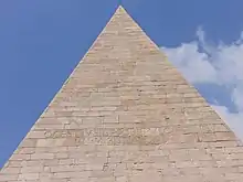 The pyramid was built for Gaius Cestius Epulo, the son of Lucius, of the tribe of Pobilia. The inscription on it mentions that Cestius was a praetor, a tribune of the plebs, and a septemvir of the Epulones. The tomb was completed in 330 days and was one of two pyramid shaped tombs in the city of Rome.[6] It is also important to note that its construction was regulated by sumptuary laws, which limit extreme displays of wealth such as in feasts, clothing, funerals, and tombs. While these laws can be traced back to the mid-5th century BC, they were much more strictly passed and enforced around the time of Cestius’ death.[3] The sharply pointed shape of the pyramid is strongly reminiscent of the pyramids of Nubia, in particular of the kingdom of Meroë, which had been attacked by Rome in 23 BC. The similarity suggests that Cestius had possibly served in that campaign and perhaps intended the pyramid to serve as a commemoration. His pyramid was not the only one in Rome; a larger one—the "pyramid of Romulus" — of similar form but unknown origins stood between the Vatican and the Mausoleum of Hadrian but was dismantled in the 16th century by Pope Alexander VI and the marble was used for the steps of St. Peter's Basilica.[2][7]