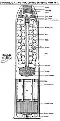 The British "Treatise on Ammunition" of 1915 stated that available rounds were Shrapnel (203 bullets), Case shot (330 bullets), Star shell and the Double common shell of 18 lb (exploding charge of 14 oz "P" mixture – gunpowder).[13]