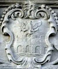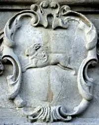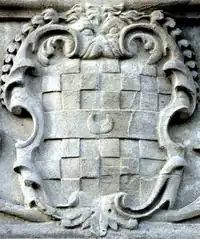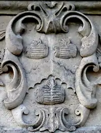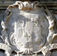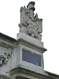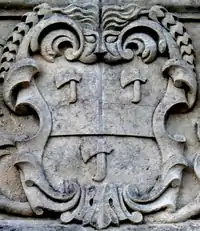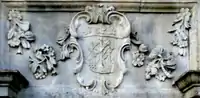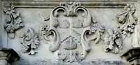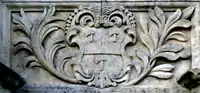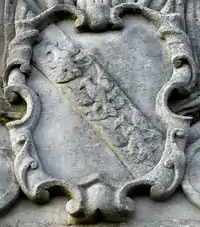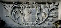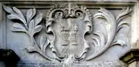 Granville: Gules, three clarions or. For George Granville, 1st Baron Lansdowne of Bideford (1666-1735), nephew of John Granville, 1st Earl of Bath (1628–1701) and heir male of William Henry Granville, 3rd Earl of Bath (1692-1711).[45] It is the only escutcheon with heraldic supporters, generally reserved for use by nobility, here Two winged griffins rampant or. Above the escutcheon is a baron's coronet. He is identifiable by the style of his coronet and by his motto, shown inscribed on a scroll below: Deo, Patriae, Amicis[46] ("For God, my Country and Friends"), the motto of his uncle John Granville, 1st Earl of Bath having been: Futurum invisibile ("The future is unseen").[47] The arms are not those of John Granville, 1st Earl of Bath (1628–1701), or of his son Charles Granville, 2nd Earl of Bath (1661–1701). The latter's son William Granville, 3rd Earl of Bath (1692-1711) died aged only 19 two years before the building was completed in 1713. | ||||
