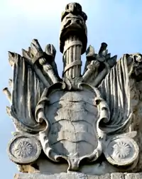 The inscription was transcribed by the Devon topographer Rev. John Swete (d. 1821) in his "Journals".[16] On the sides of the base of the statue are identical heraldic escutcheons showing the arms of Robert Rolle impaling the arms of Duke, Per fesse argent and azure, three chaplets counterchanged, for his wife Elizabeth Duke (d. 1716), daughter of Richard Duke (1652–1733),[17] MP, of Otterton, Devon.