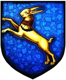 Clevland: Azure, a hare salient or collared gules pendent therefrom a bugle horn stringed sable. Arms of William Clevland (1664-1734) of Tapeley Park, Westleigh, near Bideford, another son-in-law of John Davie. He was a Scottish-born Royal Navy commander who served as Controller of Storekeepers' Accounts (1718-1732).[41] In 1702, having sailed into the North Devon port of Bideford, then one of the leading tobacco importation ports of Great Britain, he is said to have viewed from his ship the ancient mansion of Tapeley, in the parish of Westleigh, situated on an eminence overlooking the estuary of the River Torridge, and to have been so impressed by the beauty of its position that in 1704 he purchased the estate from the Giffard family of Brightley, which thenceforth he made his residence.[42] His son purchased the lordship of the manor of Bideford,[43] which thenceforward descended with the Tapeley estate, which is still owned and occupied by his descendants (via two female lines) the Christie family, also of Glyndebourne House, East Sussex. | ||||