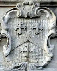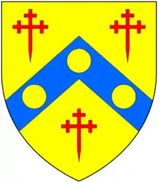 Crossing:(?) A chevron between three cross crosslets (unknown). Apparently Crossing of Exeter, given similarly by Vivian as Or, on a chevron azure between three crosses crosslet fitchée gules as many bezants[39] which family was heir to the Dodderidge family of Barnstaple and of Bremridge, South Molton. Hugh Crossing was Mayor of Exeter in the 17th century[39] and his eldest son Francis Crossing (c.1598-1638) was Member of Parliament for Mitchell in 1626 and for Camelford in 1628.[40] | ||||