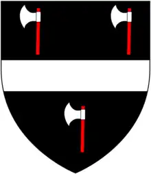 Wrey: Sable, a fesse between three pole-axes argent helved gules. For Sir Bourchier Wrey, 5th Baronet (c. 1683-1726) of Tawstock Court, about 2 miles downstream of Barnstaple on the River Taw. A Cornish family which married the heiress of the Bourchier Earls of Bath, seated at Tawstock Court, heirs of the ancient feudal barons of Barnstaple. Today the Wrey baronets retain ownership of the estate of Tawstock, having sold Tawstock Court. | ||||