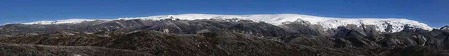 The Quelccaya ice cap[lower-alpha 1] extends up to 17 kilometres (11 mi) from the north to south and between 3 and 5 kilometres (1.9 and 3.1 mi) from east to west.[28] Quelccaya is a low-elevation ice cap that rises above the surrounding terrain;[13][34] the ice cap lies at 5,200–5,700 metres (17,100–18,700 ft) elevation.[35] The highest summit in the area of the ice cap is Joyllor Puñuna; its elevation above sea level is variously given as 5,743 metres (18,842 ft),[5] 5,645 metres (18,520 ft)[36] or 5,670 metres (18,600 ft).[37] Nevado Jatun Quenamari and Nevado Cuncunani form eastward extensions of the ice cap.[38] Snowline elevation has been estimated at 5,250–5,300 metres (17,220–17,390 ft).[39]