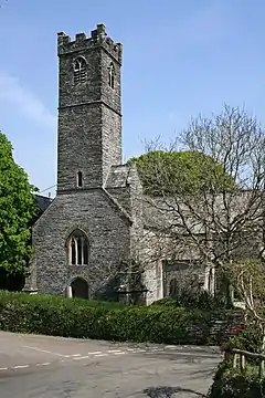 The original church was cruciform in plan but a tower was added (probably in the 13th century) and then the aisle. There are old wagon roofs and a funeral recess (14th century). The stained glass and some other ornamental work is the handiwork of the late 19th century vicar, William Willimott, and there are three brasses (1471 to Roger Kyngdon, and 1631 to Richard Chiverton, d. 1617, and his wife).[5] The church was restored in the 1880s after becoming virtually ruinous in the 1870s. Willimott's predecessor as vicar was the Rev Dr John Rooke Fletcher (d. 1878) who was vicar for 61 years.[6] There were Methodist chapels and almshouses (Directory for 1873).