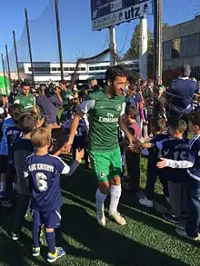 On 12 May 2012, it was announced Raúl had signed a deal with Qatari Football Club Al Sadd for the 2012–13 Qatar Stars League season.[43][44] He played his first competitive match for the club on 5 August in the 2012 Sheikh Jassem Cup, scoring a penalty in extra time in order to secure a 2–0 win against Mesaimeer.[45] The veteran also took on the role of captain after Abdulla Koni was substituted.[46] On 13 April 2013, Raúl captained Al Sadd to the 2012–13 Qatar Stars League title. Raúl scored 9 goals in 22 appearances to help Al Sadd win their first title in five years.[47] He was also presented with the post-season QFA-sanctioned Fair Play Award in May 2013.[48]