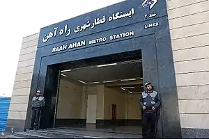 Raah Ahan Metro Station or Railway Metro Station is a station of Mashhad Metro Line 2. The station opened on 15 February 2017. It is located on Kamyab Boulevard, next to Mashhad railway station.[1]